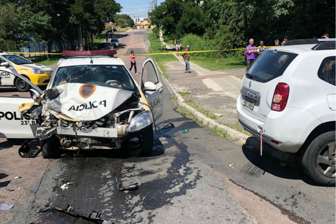 Uma dupla de policiais militares que perseguia uma moto suspeita se envolveu num acidente no começo da tarde deste sábado (30). A colisão, entre a viatura e uma Duster, aconteceu na Cidade Industrial de Curitiba (CIC). Apesar do susto e do impacto da batida, ninguém se feriu com gravidade.