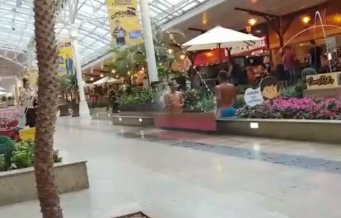 Um vídeo postado na página Curitiba Mil Grau, no Facebook, viralizou neste final de semana. Dois jovens aparecem tomando banho em um chafariz dentro do shopping Estação, no Centro de Curitiba. Nas imagens os dois brincam e se refrescam dentro do lago artificial. Os clientes passam pelo local rindo e achando a atitude curiosa.