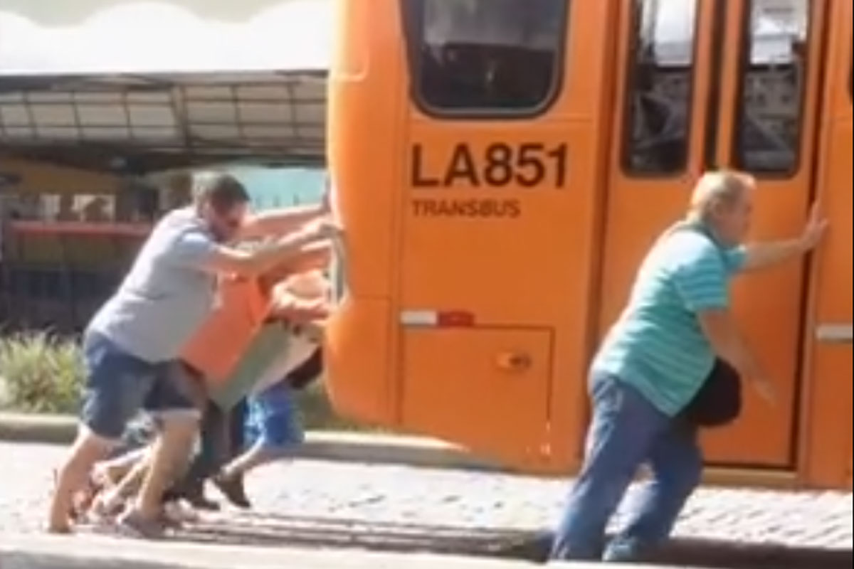 Um vídeo postado nas redes sociais mostra um grupo de passageiros ajudando o motorista a empurrar um ônibus da linha Mossunguê, que aparentemente teve uma pane mecânica. A postagem relaciona o problema do ônibus ao reajuste da tarifa, que subiu para R$ 4,25 em Curitiba.
