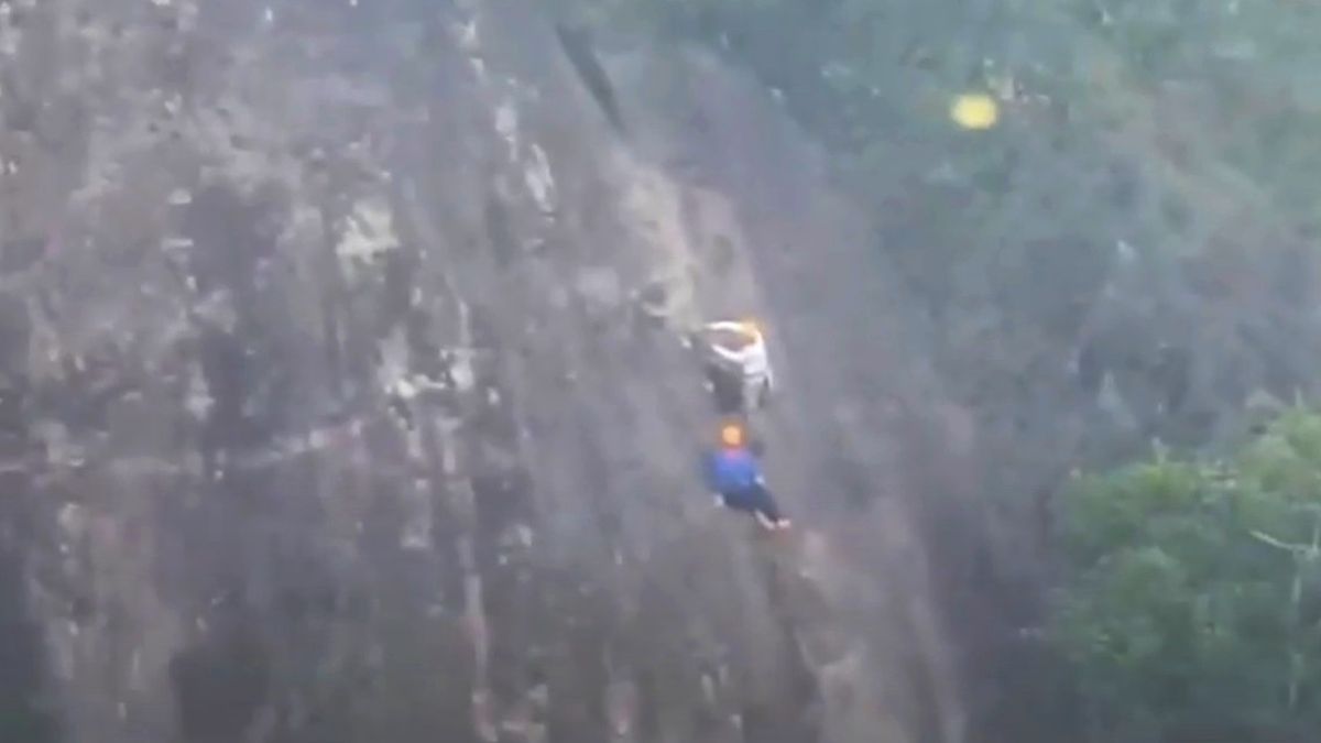 As imagens do resgate foram feitas de dentro do helicóptero. O vídeo mostra os dois escaladores ainda presos no morro Cabaraquara.