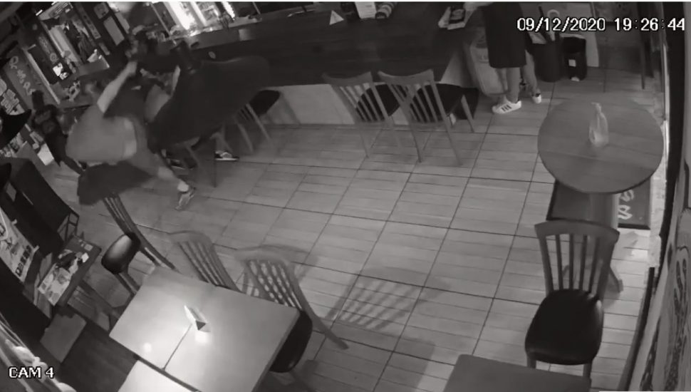 As câmeras de segurança revelam o momento em que um casal foi agredido na última quarta-feira (9) a socos e pontapés. O homem vítima da agressão teria engasgado e uma crise de tosse foi o que motivou um outro cliente que estava no local a levantar da cadeira e bater no casal alegando que os dois estavam com coronavírus.