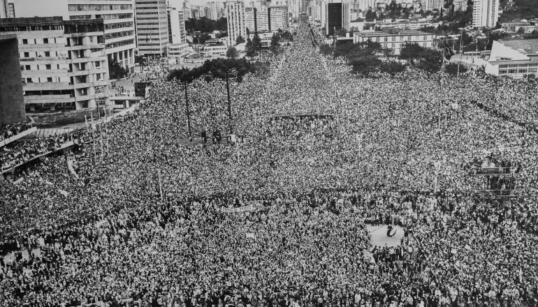 Multidão em frente ao Palácio Iguaçu. Foto: Reprodução/MIS-PR e Arquivo Público Paranaense
