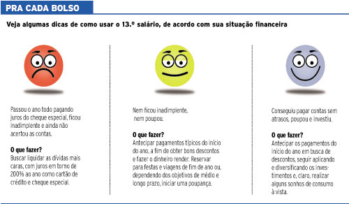 De posse do quanto receberá a mais, cada pessoa deve diagnosticar qual é situação financeira e trilhar caminhos (veja o quadro), sem perder o foco de ajustar as despesas ao padrão de vida. “O endividamento é um problema que tem de ser resolvido com o próprio salário, reduzindo os gastos, pois o 13.º salário foi criado, em 1962, como benefício extra”, explica Domingos.