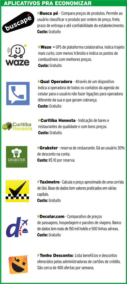 Com as novas tecnologias e o uso cada vez maior dos smartphones, os caminhos para economizar estão cada vez mais fáceis. Hoje com um simples toque na tela do aparelho de celular é possível descobrir os lugares e empresas que oferecem os melhores preços. Embora os aplicativos ainda estejam em fase de expansão no mercado, com um nicho grande de exploração pela frente, já são várias opções de ajuda ao bolso em diferentes áreas como viagens, restaurantes, bares, compras e até postos de combustíveis.