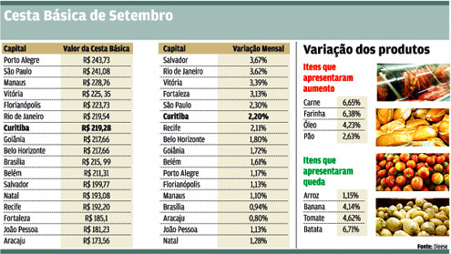A variação em Curitiba foi a sexta maior do País, e deixou a capital com a sétima cesta mais cara do Brasil. O maior valor está em Porto Alegre (R$ 243,73) e o menor, em Aracaju (R$ 173,56).