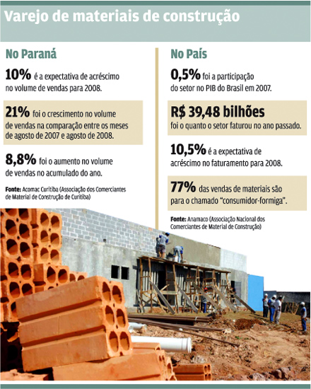O comércio de materiais de construção já está sentindo os reflexos da crise financeira internacional. Segundo o presidente da Associação dos Comerciantes de Material de Construção de Curitiba (Acomac Curitiba), Rogério Martini, as vendas caíram cerca de 30% nos últimos dez a quinze dias. O motivo é o aumento da exigência na hora de conceder crédito, principalmente para as classes C, D e E.