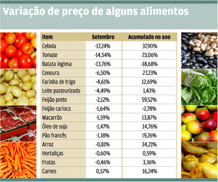 Os produtos alimentícios registraram deflação de 0,27% no mês passado, mais intensa do que a queda apurada em agosto, de 0,18% Já os não alimentícios registraram alta de 0,42% em setembro, na mesma variação de agosto.
