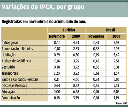 Mesmo assim, a capital paranaense acumula a maior variação pesquisada no País, com 4,54% entre janeiro e novembro de 2009. O IPCA nacional está acumulado, em 2009, em 3,93%.