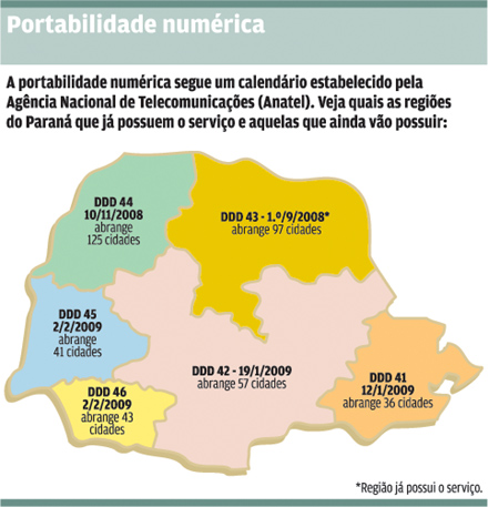 Segundo dados da Associação Brasileira de Recursos de Telecomunicações (ABR Telecom) – entidade que está administrando a portabilidade no Brasil – já foram efetuados 7.895 pedidos no Paraná, só contando a região de Londrina, com DDD 43, única com o recurso até agora. O restante do Paraná terá acesso ao serviço a partir do dia 11 de novembro deste ano, mas Curitiba e região, somente no ano que vem (veja quadro).