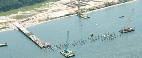 Como o calado de 16 metros está a 230 metros da costa, a maior parte dos investimentos está sendo aplicada na construção de um pier de 630 metros que liga a praia ao local.