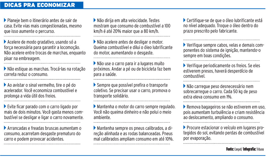Técnicos do Conpet apontam que através da mudança de alguns hábitos é possível executar as mesmas atividades do dia a dia com seu veículo e reduzir o consumo de combustível. Não é preciso deixar de usar o carro, basta fazer a manutenção periódica e usá-lo com eficiência, evitando desperdícios. Outra recomendação é abastecer sempre em postos que garantam a qualidade do combustível. Resultados? Além de beneficiar o bolso, você ajuda a diminuir a poluição urbana e contribui para seu próprio bem-estar e segurança.