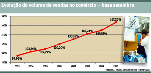 O Rio de Janeiro apresentou alta de 13%, mas houve locais em que o comércio avançou até 76,8% na comparação com setembro de 2009, como o que foi verificado em Tocantins. Se observar a evolução das vendas desde 2003 no Brasil (confira o quadro) fica clara a expansão do setor em todo o território nacional.