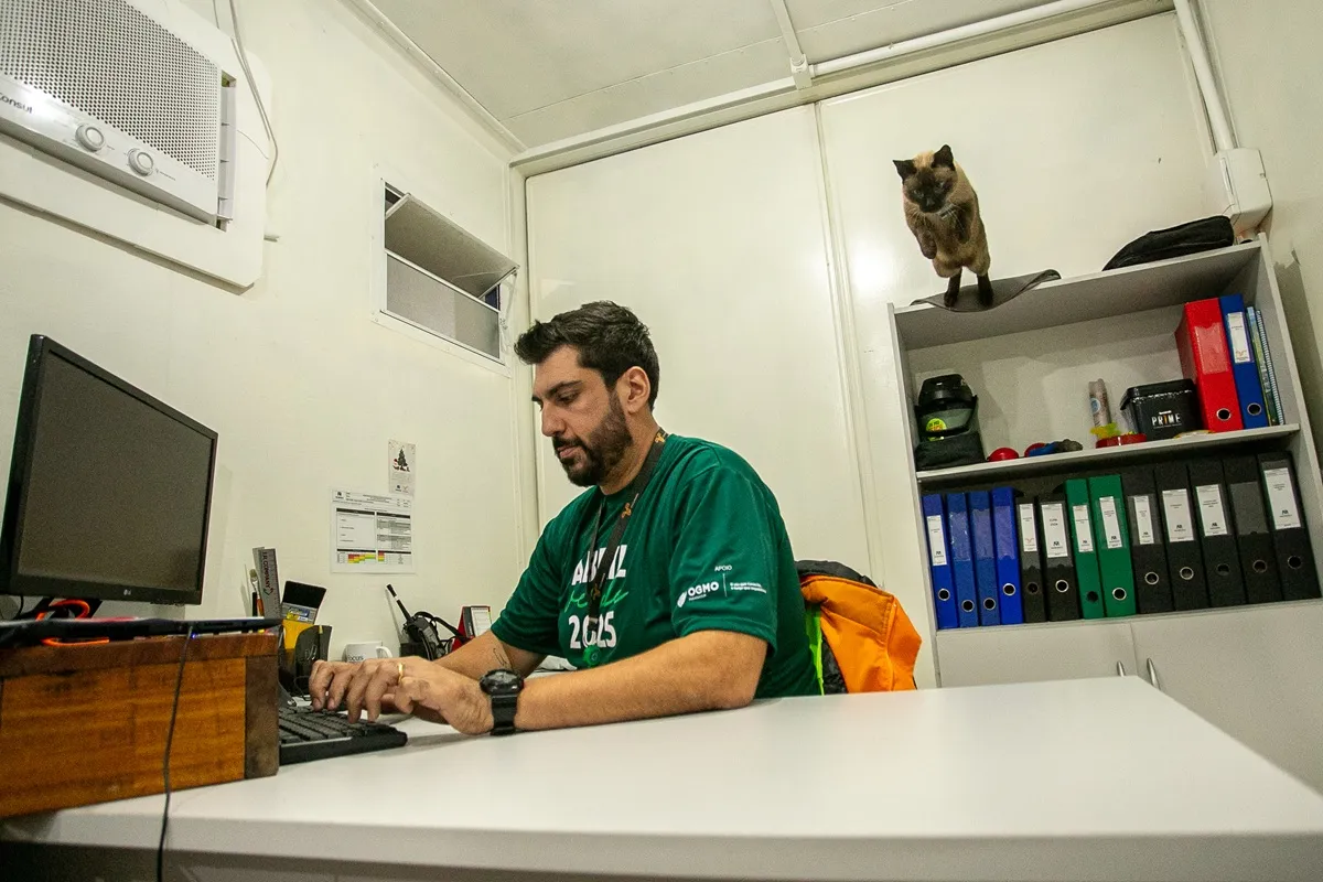 Marcelo apareceu ano passado na área e foi observado primeiramente pelo engenheiro de segurança do trabalho, Felipe Zeppelini. “Na época, falei com o Marcos, que é o nosso engenheiro e tem gatos em casa, para trazer ração. No dia seguinte, ele trouxe o potinho e a comida. Logo depois, apareceu o bichano e começamos a cuidar dele”, disse Felipe.
