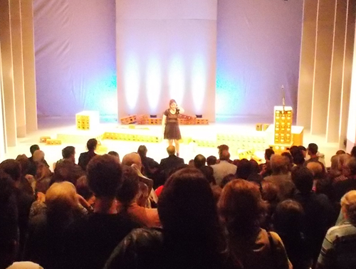 O cenário era simples: um palanque e uma passarela, montados no palco com tijolos. Eles, no início da peça, estavam separados, mas a garota usa de tijolos que estão espalhados pelo palco para liga-los e poder subir ao microfone para seu discurso. A atriz Clarissa Kahane vestia um vestido preto idêntico ao que Noa usou no velório real de seu avô em 1995 e a plateia ficou visivelmente emocionada com o discurso. Ao final da apresentação, cansada, Kahane foi aplaudida de pé pelo público por talvez um minuto inteiro.