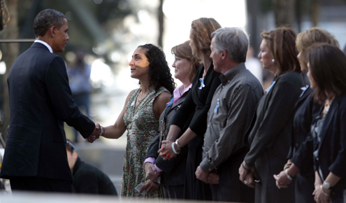Obama, de mãos dadas com sua mulher Michelle e suas filhas, caminhou primeiro com o ex-presidente George W. Bush e a esposa dele Laura, para o North Memorial Pool, criado na área onde estavam localizadas as antigas torres. Em seguida, todos os quatro abaixaram suas cabeças silenciosamente. Depois disso, o grupo dispensou cumprimentos e abraços aos familiares daqueles que morreram nos ataques terroristas.