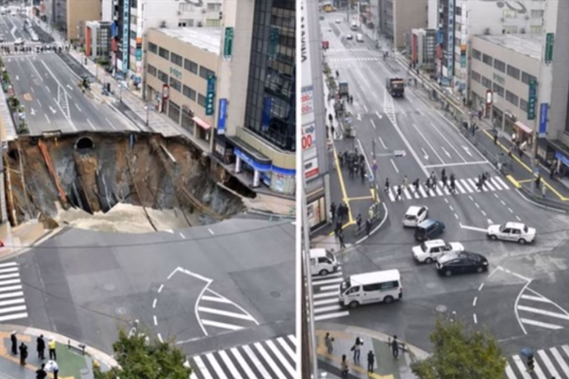 A cratera que os japoneses fecharam em tempo recorde voltou a ser notícia. De acordo com os jornais The Japan Times e The Japan News, o solo voltou a ceder no local e o trânsito teve que ser interditado.