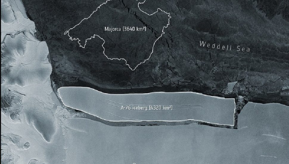 Um iceberg chamado pelos cientistas A-76 desprendeu-se da plataforma de Ronne, na Antártica. Ele é considerado pela Agência Espacial Europeia o maior do mundo. São 4.320 quilômetros quadrados (km²) de gelo a flutuar no Mar de Weddell, perto da Antártica.