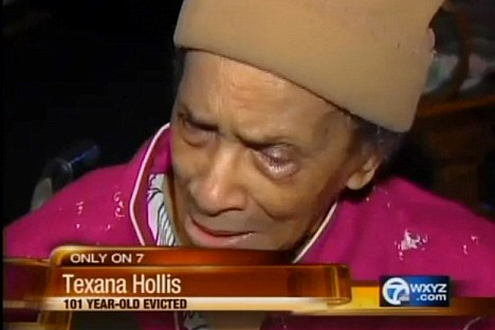 A falta de pagamento de imposto e uma hipoteca fizeram com que uma mulher de 101 anos fosse despejada de sua residência em Detroit, nos Estados Unidos. Texana Hollis viveu no imóvel por nada menos que 60 anos, agora ela está desesperada. “Aqui estou eu, com 100 anos de idade e sem lugar para viver”, relatou a senhora.