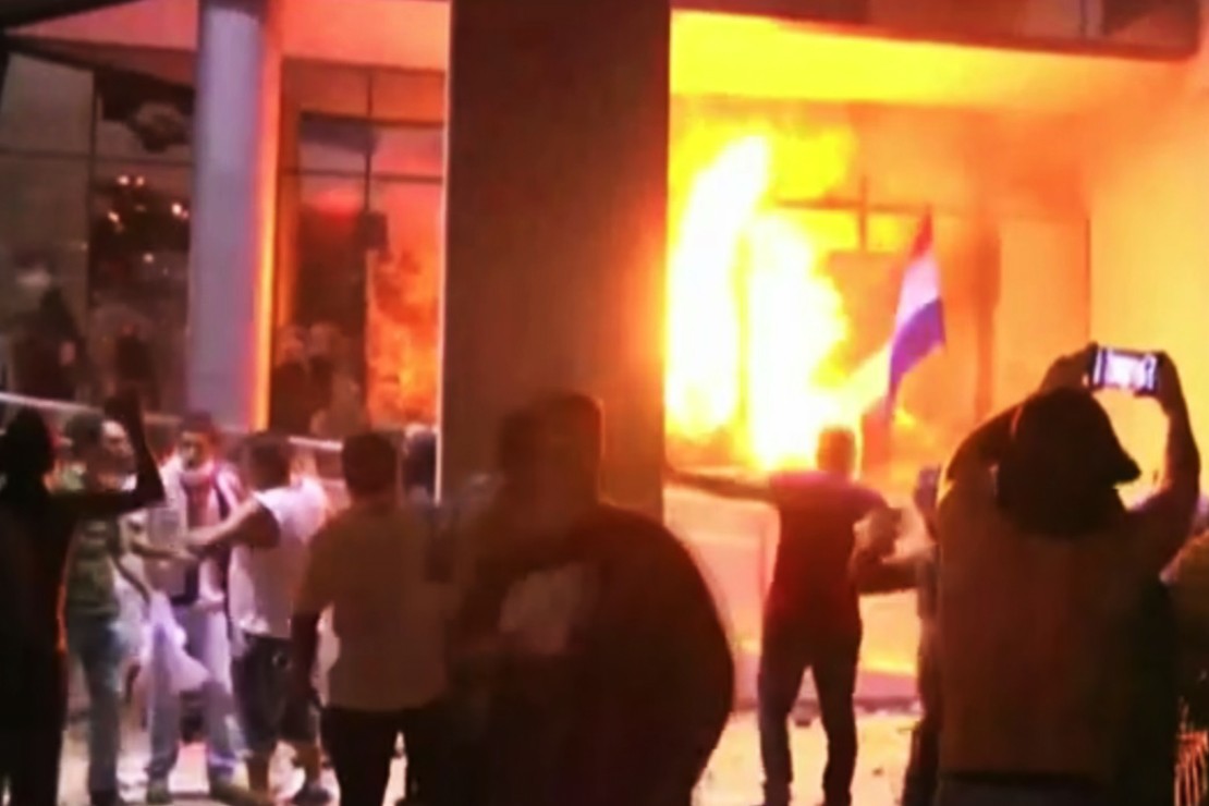 Durante a madrugada de sábado, os manifestantes invadiram o primeiro andar do edifício público e incendiaram papéis e móveis. A polícia usou canhões de água e balas de borracha e os bombeiros conseguiram conter as chamas.