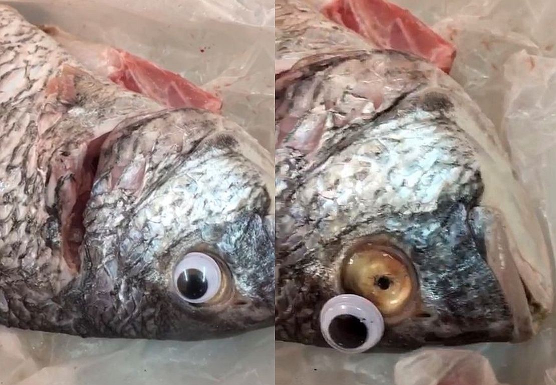Uma das principais dicas na hora de se comprar um peixe é olhar como estão os olhos do pescado, se parecem “vivos e brilhantes”. Uma peixaria no Kuwait resolver dar um migué e pra disfarçar o estado lastimável de um peixe, meteu uma “lente de contato” no pescado. É isso mesmo. Para parecer mais fresco, o dono da peixaria pôs um olho falso.
