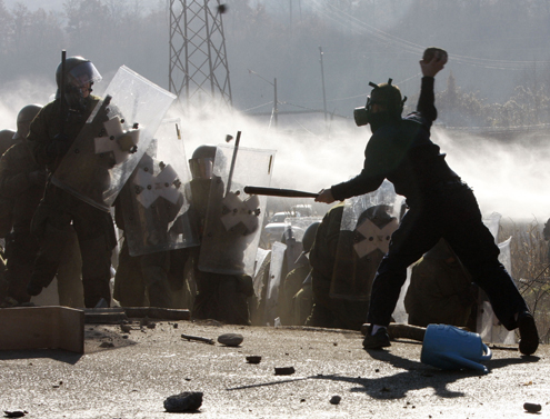 Manifestantes sérvios entram em confronto com soldados da OTAN em Jagnjenica, Kosovo, nesta segunda-feira (28). Dois soldados da OTAN em missão de paz foram baleados durante os confrontos. Em 2008, o Kosovo declarou independência da Sérvia, causando forte tensão entre sérvios que recusam a secessão.
