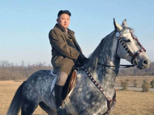 Kim Jong-un, o jovem ditador da Coreia do Norte, mira o horizonte montado a cavalo. Em outra imagem, como um superstar, é abraçado por mulheres, que choram.