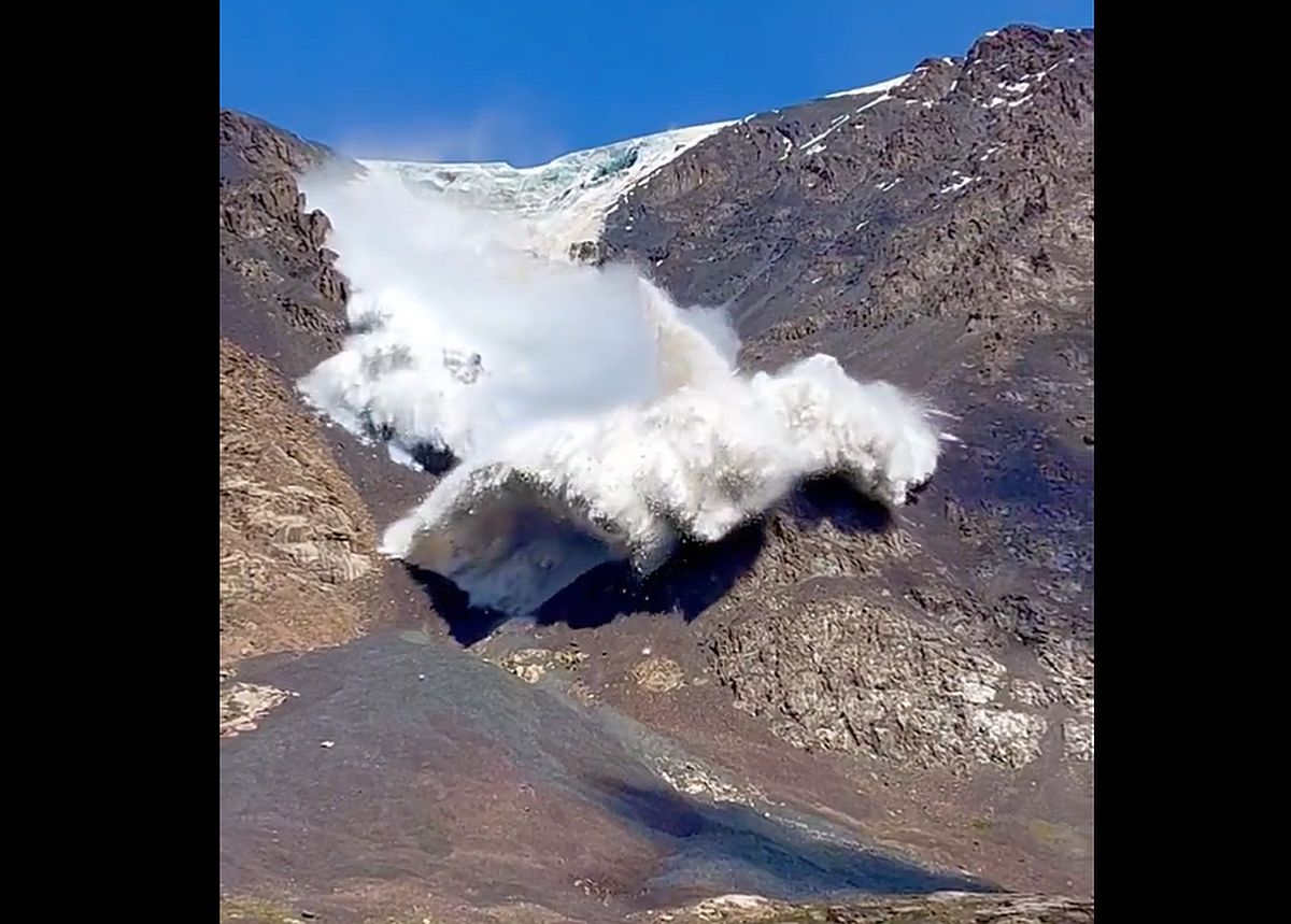 Uma avalanche impressionante atingiu um grupo de turistas nas montanhas Tian Shan, no Quirguistão. Um vídeo postado no Instagram traz imagens impressionantes do momento em que a grande massa de gelo atinge um dos turistas que estavam na região. Harry Shimin gravou o momento exato em que a avalanche o encobriu.