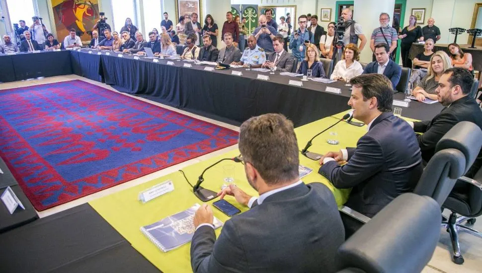 O novo prefeito de Curitiba, Eduardo Pimentel, conduziu nesta quinta-feira (02) a primeira reunião de secretariado em sua gestão. O local escolhido na sede da prefeitura foi o Salão Brasil. A primeira ação do gestor foi a assinatura do decreto que implementa a meia tarifa do transporte público aos domingos e feriados a R$ 3.