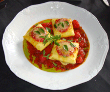 Misture a farinha, o ovo e a semolina, depois passe no cilindro, deixando-a bem fina. Corte-a em quadrados 15 x 15 cm, cozinhando durante 1 minuto. Dê um choque térmico, seque a massa e reserve.