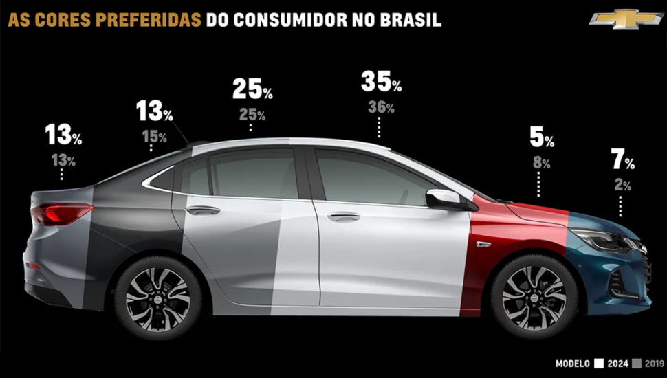 A cor preferida do cliente Chevrolet, no entanto, continua sendo a branca, assim como a maioria dos consumidores ao redor do mundo. Cerca de um terço dos veículos novos da marca emplacado no Brasil neste último ano foram brancos (35%), seguido pelos carros pratas (25%), pretos (13%) e cinzas (13%).