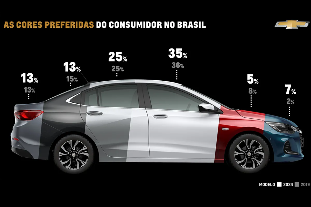 A cor preferida do cliente Chevrolet, no entanto, continua sendo a branca, assim como a maioria dos consumidores ao redor do mundo. Cerca de um terço dos veículos novos da marca emplacado no Brasil neste último ano foram brancos (35%), seguido pelos carros pratas (25%), pretos (13%) e cinzas (13%).