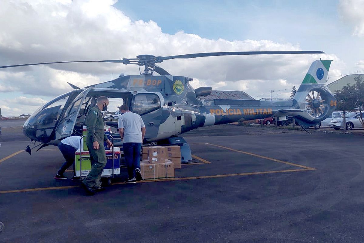 No último mês mais de 20 missões do Batalhão de Polícia Militar de Operações Aéreas (BPMOA) foram realizadas com um único objetivo: expandir ainda mais a vacinação contra a covid-19 no estado. A força-tarefa, que conta com um avião, dois helicópteros do BPMOA e mais algumas aeronaves da Casa Militar reservadas ao serviço, levou insumos a dezenas de cidades – algumas de difícil acesso.