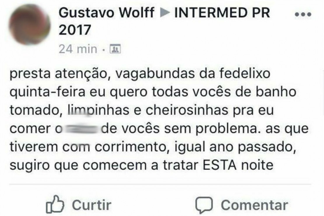 Um estudante de medicina da Universidade Estadual de Londrina despertou a ira e revolta em muita gente, principalmente nas redes sociais. O motivo de tanta indignação foi a postagem feita por ele no dia 31 de agosto, em um grupo fechado do evento Intermed Paraná 2017, os jogos universitários da Liga das Atléticas de Medicina do Paraná. Na publicação, feita com palavras de baixo calão e conteúdo machista e misógino, o universitário Gustavo Wolff ofende estudantes da Universidade Federal do Paraná (UFPR), chamando as universitárias de “vagabundas”.