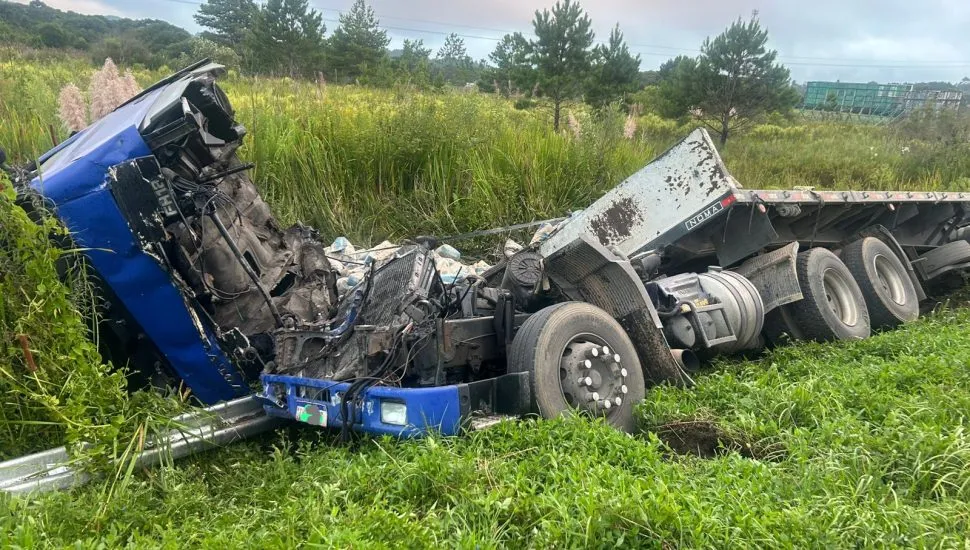 De acordo com informações da Polícia Rodoviária Federal (PRF), uma das carretas acabou tombando no acostamento após o impacto. Imagens do local mostram a cabine severamente danificada e praticamente arrancada do chassi.