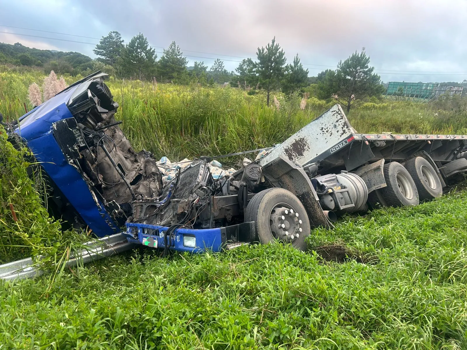 De acordo com informações da Polícia Rodoviária Federal (PRF), uma das carretas acabou tombando no acostamento após o impacto. Imagens do local mostram a cabine severamente danificada e praticamente arrancada do chassi.