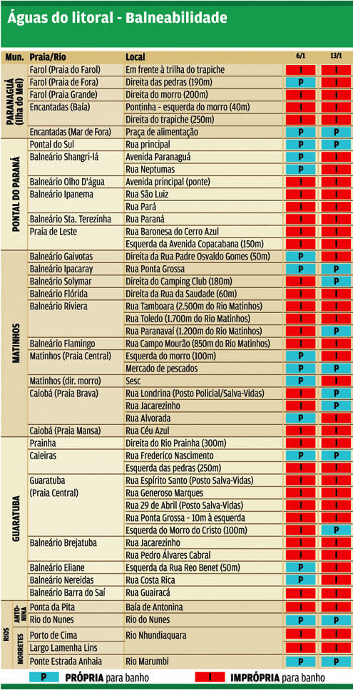 De 48 pontos analisados nas praias e em quatro rios de Morretes e da baía de Antonina, 36 foram considerados impróprios para o banho (ver quadro). Os pontos são escolhidos por terem maior concentração de pessoas e por haver possibilidade de emissão de esgoto.