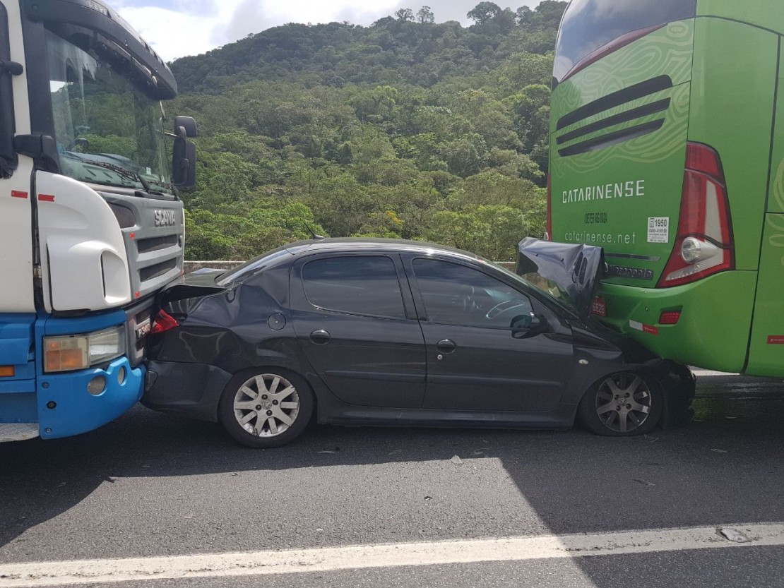 Não se sabe o que teria provocado o acidente, mas um dos veículos não conseguiu frear e provocou um engavetamento. Com a colisão, o carro ficou prensado entre um dos caminhões e o ônibus.