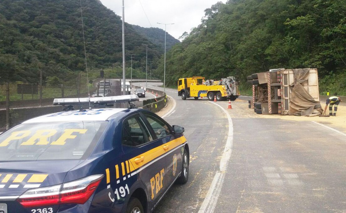 O tombamento de um caminhão carregado com soja causou, por mais de duas horas, interdição total no quilômetro 671 da BR-376, na região de Guaratuba, litoral do Paraná. O acidente ocorreu no sentido Sul, na região de descida da Serra do Mar.