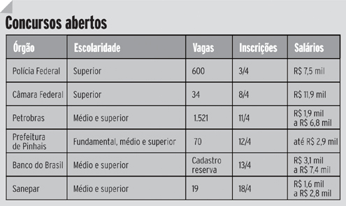 Garcez comenta ainda que os concursos em nível nacional são os mais procurados e responsáveis pela abertura de novas turmas nos cursos preparatórios. “Vagas ofertadas pela Receita e Polícia Federal, INSS e Caixa Econômica Federal são as mais interessantes para os candidatos”, revela. E para quem está pensando em concorrer a essas oportunidades, a dica é disciplina. “Oriento meus alunos a se preparar passando por três fases: teoria, exercícios e simulados referentes a concursos anteriores”, sugere.