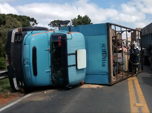 Por isso, perdeu o controle do caminhão, carregado com galões de óleo lubrificante e diesel, e tombou na pista sentido Colombo, por volta das 10h desta terça-feira (17). Houve vazamento de óleo no asfalto, mas a ação rápida dos bombeiros impediu que se espalhasse.