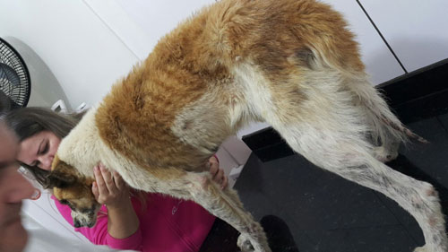 O bichinho, que parece já ter mais idade, foi resgatado e está internado em uma clínica veterinária no Santa Quitéria, em Curitiba. “Conseguimos trazê-lo e agora ele está recebendo todo o tratamento que merece. Mas está sofrendo muito, porque sente fome e não consegue comer direito”.