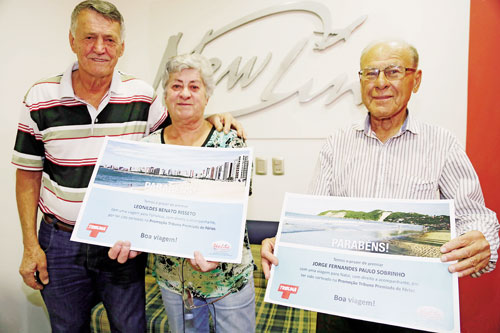 Faltou lugar para tanta alegria ontem, quando os dois sortudos da promoção Tribuna Premiada de Férias receberam os vouchers das viagens na agência New Line Tour Operador, parceira da promoção. Daqui três semanas a leitora Leonildes B. Risseto, 66 anos, irá embarcar rumo a Fortaleza (Ceará) e o leitor Jorge F. Paulo Sobrinho, 80, seguirá para Natal (Rio Grande do Norte).