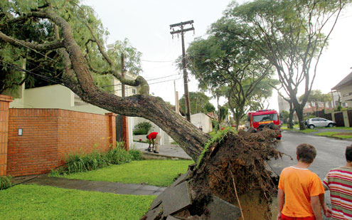 Os bombeiros trabalharam durante a noite para reparar os danos do temporal. A previsão do tempo para hoje, segundo o Simepar, é mais temporais em todo o Paraná. Nova frente fria deve fazer com que as chuvas venham acompanhadas de raios e ventos fortes. Os de ontem chegaram a 65 quilômetros por hora.