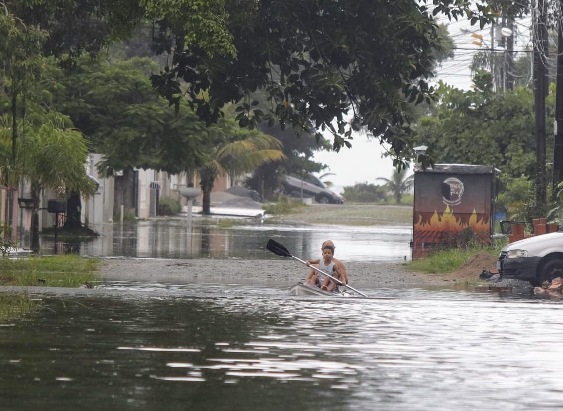 A chuva caiu com força na manhã deste sábado no litoral do Paraná e alagou dezenas de ruas e casas, especialmente em Matinhos. Pontal do Paraná e Guaratuba também tiveram problemas com a precipitação, que foi acima da média (34 mm) e surpreendeu os veranistas