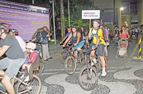Aproximadamente 700 ciclistas participaram, na noite de ontem, de protesto contra a violência contra os ciclistas no trânsito. O movimento, denominado Bicicletada, aconteceu em 38 cidades do País (11 capitais) e também na Venezuela. Em Curitiba, a rota iniciou no pátio da reitoria da Universidade Federal do Paraná e percorreu as principais ruas da cidade. O protesto aconteceu depois da morte de cinco ciclistas na semana passada. Os acidentes aconteceram em São Paulo, Santa Catarina, Pará, Pernambuco e no Distrito Federal.
