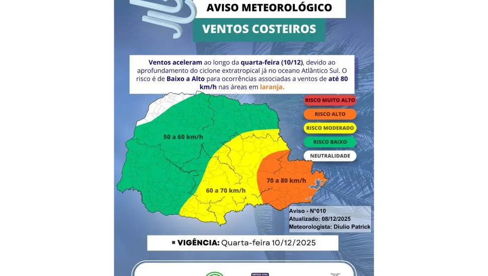 Um ciclone extratropical formado no Rio Grande do Sul está causando ventos fortes e rajadas em quase todas as regiões do Paraná desde a madrugada desta quarta-feira (10). Segundo o Sistema de Tecnologia e Monitoramento Ambiental do Paraná (Simepar), a velocidade média dos ventos aumentou significativamente em várias cidades do estado.