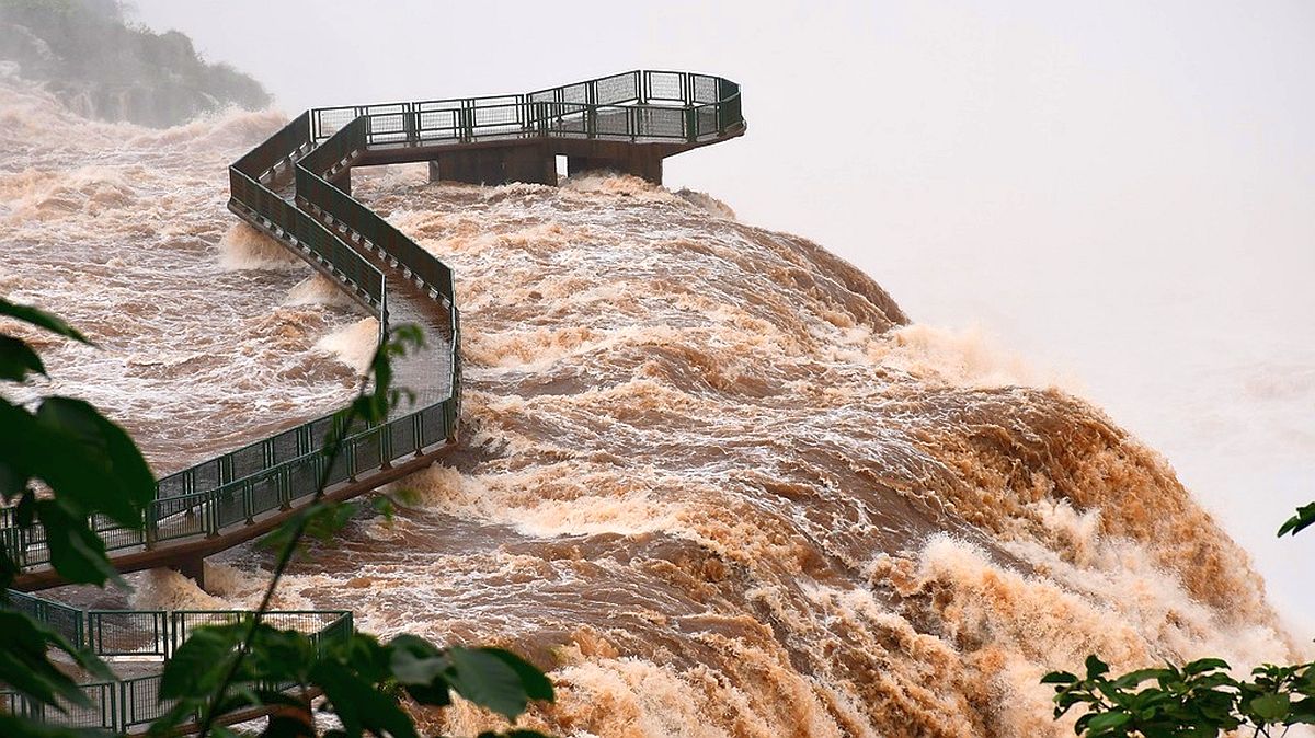 As fortes chuvas que caem em todo o Paraná nesta semana encheram o Rio Iguaçu e aumentaram a vazão das Cataratas do Iguaçu, em Foz do Iguaçu, no Oeste do Paraná. Nesta sexta-feira (3), no início do dia, o volume de água bateu a marca de dez milhões de litros por segundo, quase sete vezes acima da média. Isso fez a direção do Parque Nacional interditar a passarela de acesso à Garganta do Diabo.