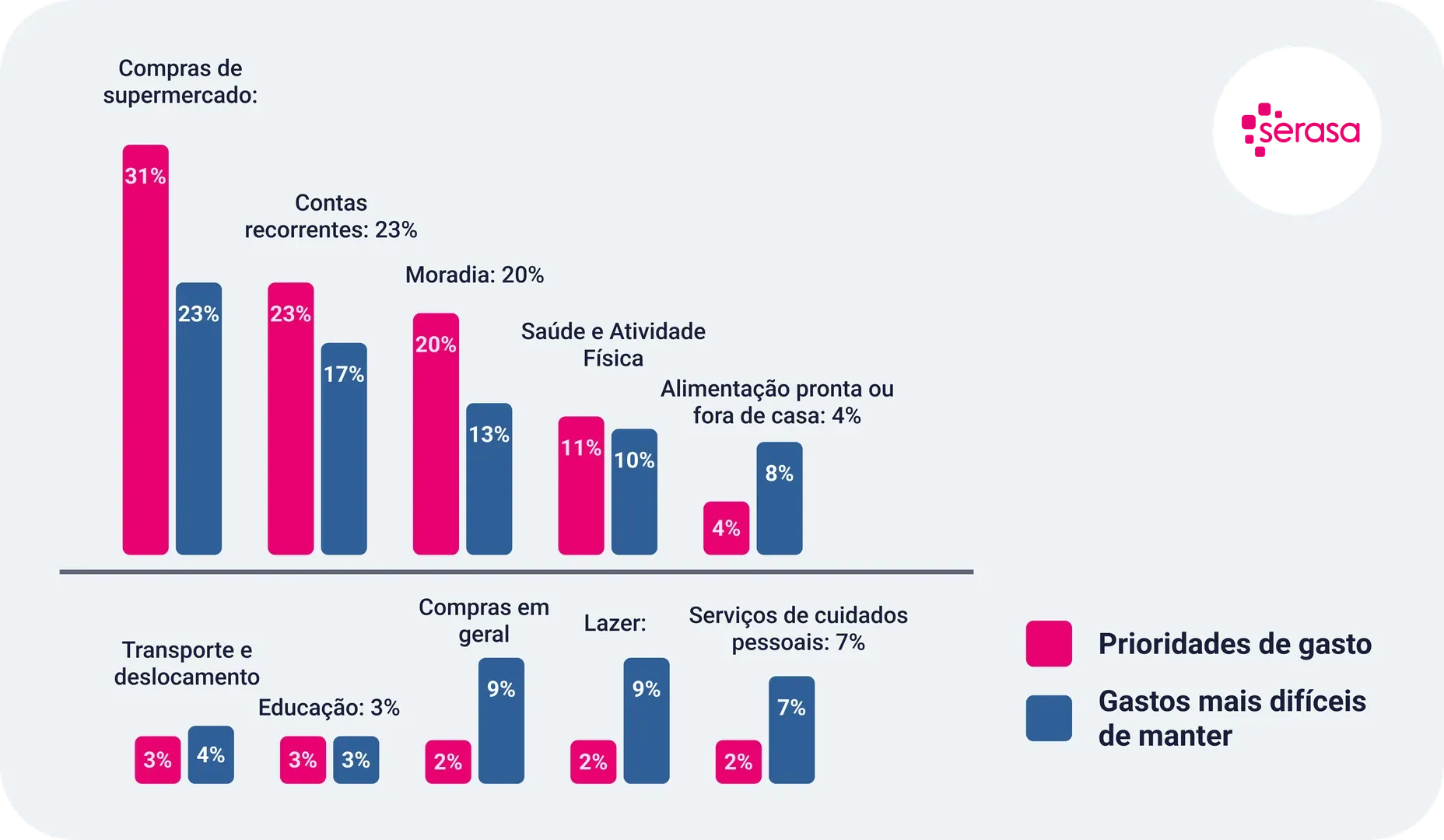 O maior peso no orçamento dos brasileiros é o supermercado. Em seguida aparecem as contas recorrentes, como água, luz e internet, e os gastos com moradia. Somados, esses três grupos comprometem aproximadamente 57% da renda mensal.
