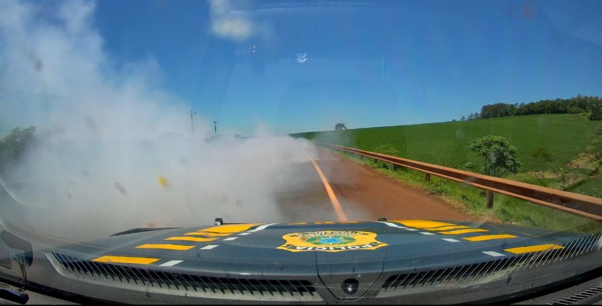 A PRF tentou interceptar o carro, um Volkswagen Spacefox que parecia abandonado nas cercanias da BR-163 por volta de meio-dia. Quando a viatura se aproximou para abordagem, o carro acelerou. Os policiais ainda jogaram a viaturao para cima do veículo, mas não conseguiram pará-lo. A partir de então, o motorista acionou o dispositivo de fumaça para despistar a polícia.