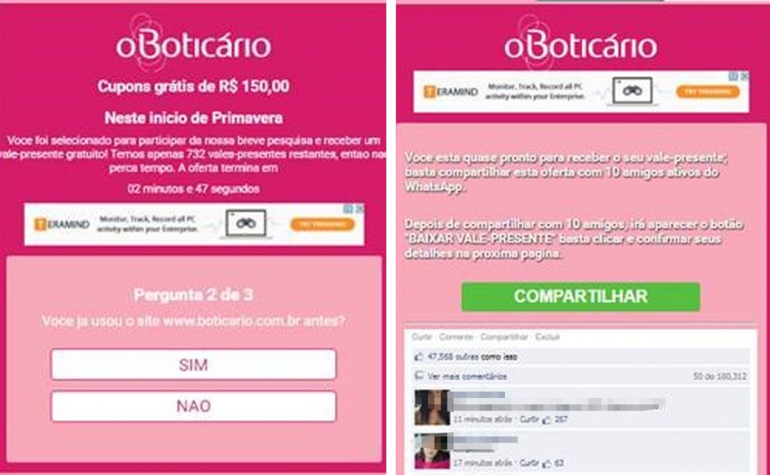 Ao acessar o link malicioso, é solicitado que o usuário responda a três perguntas para ganhar o suposto voucher (“Você fez compras na O Boticário no ano passado?”; “Você já usou o site do Boticário antes?” e “Você recomendaria O Boticário a um amigo ou membro da família?”). Independentemente das respostas fornecidas, a vítima é encaminhada a uma página que solicita o cadastro em serviços de SMS pago – que efetuam cobranças indevidas – ou, então, pede que os usuários baixem apps falsos, que podem infectar o smartphone e deixá-lo vulnerável a outros tipos de crimes e/ou prejuízo financeiro.